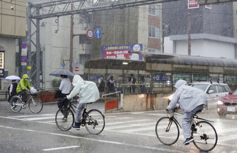 NAHA, Japan (AP) — Heavy rains intensified by Tropical Storm Mawar fell on Japan’s main archipelago Friday, halting trains and triggering floods and mudslides in central and western regions where residents were urged to use caution or evacuate.