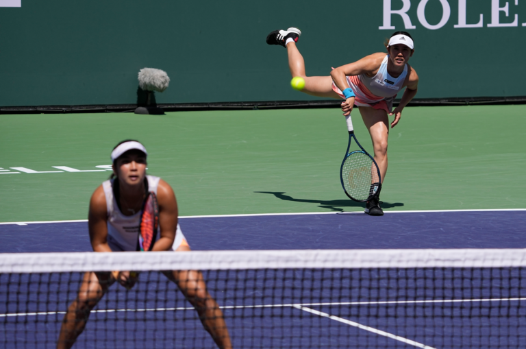 PHOTO FILE – Miyu Kato, of Japan, right, serves behind her partner Aldila Sutjiadi, of Indonesia, as they play against Beatriz Haddad Maia, of Brazil, and Laura Siegemund, of Germany, in a doubles semifinal match at the BNP Paribas Open tennis tournament Friday, March 17, 2023, in Indian Wells, Calif. French Open doubles player Miyu Kato and her partner Aldila Sutjiadi have been forced to forfeit a match when Kato accidentally hit a ball girl in the neck with a ball after a point during their match against Marie Bouzkova and Sara Sorribes Tormo on Sunday, June 4, 2023. (AP Photo/Mark J. Terrill, File)