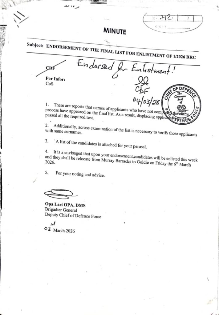 Documents suggest Colonel Yahamani was fully aware of recruitment irregularities but pushed for the enlistment anyway. While Brigadier General Opa pointed out these flaws in a minute to Yahamani dated March 3, 2024, CDF Polewara ignored the warnings. By way of a footnote the very next day, Polewara endorsed the enlistment request.